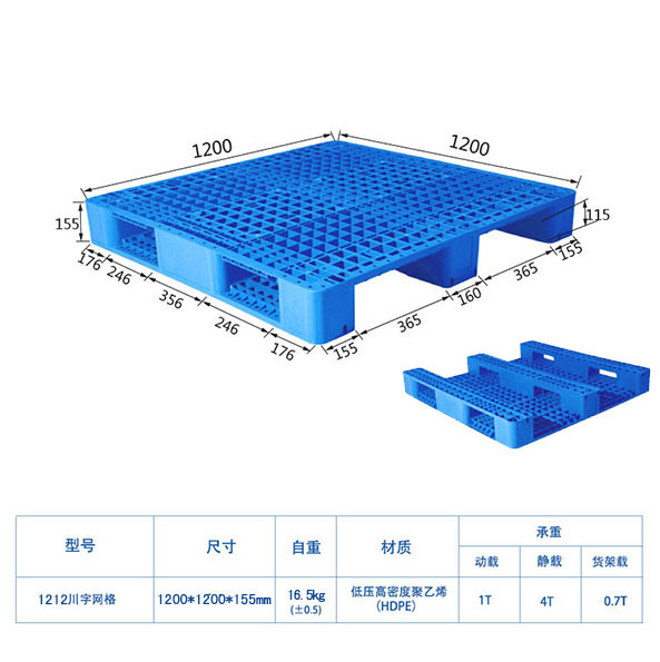 【尺寸】1200*1200*155mm 【自重】16.5kg(±0.5) 【載重】1噸,靜載4噸 【材質(zhì)】PP/PE 【顏色】藍色 【鋼管】可內置10根鋼管,加鋼管后動(dòng)載1噸,靜載4噸 【備注】川字網(wǎng)格塑料托盤(pán)能使用叉車(chē)周轉貨物,可以上貨架使用(上貨架時(shí),承載量根據貨架結構而定,嚴禁超載使用)